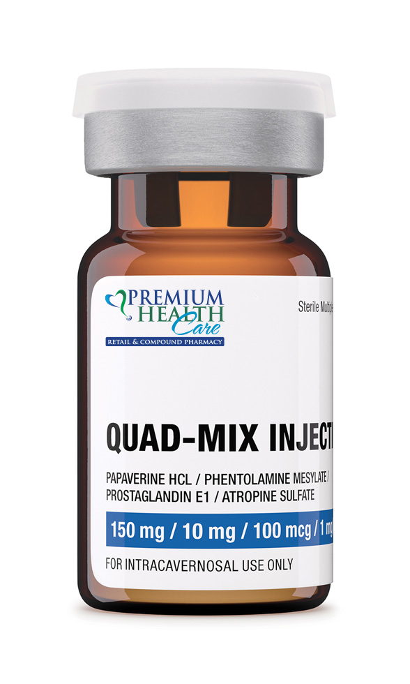 Quad-Mix is administered as a penile self-injection, typically considered to be the most powerful class of anti-erectile dysfunction agents.[1] While the components of Quad-Mix (Papaverine, Phentolamine, Prostaglandin E1, Atropine) are, on their own, indicated for a vast number of different conditions, the practice of bringing them together in concert to treat erectile dysfunction has become commonplace in sexual medicine and is now considered the go-to treatment if a patient is not responsive to conventional PDE5 inhibitors such as Viagra or Cialis.[1][2] Quad-Mix is used in the treatment of erectile dysfunction in males. Quad-Mix contains four drugs from complimentary classes designed to act synergistically, mixed into a sterile injection. They are: